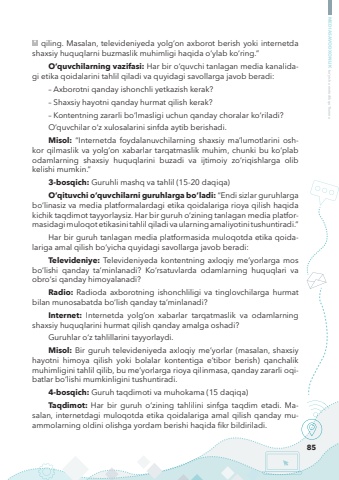 85MEDIASAVODXONLIK bo%u2018yicha metodik qo%u2018llanmalil qiling. Masalan, televideniyeda yolg%u2018on axborot berish yoki internetda shaxsiy huquqlarni buzmaslik muhimligi haqida o%u2018ylab ko%u2018ring.%u201dO%u2018quvchilarning vazifasi: Har bir o%u2018quvchi tanlagan media kanalidagi etika qoidalarini tahlil qiladi va quyidagi savollarga javob beradi:%u2013 Axborotni qanday ishonchli yetkazish kerak?%u2013 Shaxsiy hayotni qanday hurmat qilish kerak?%u2013 Kontentning zararli bo%u2018lmasligi uchun qanday choralar ko%u2018riladi?O%u2018quvchilar o%u2018z xulosalarini sinfda aytib berishadi. Misol: %u201cInternetda foydalanuvchilarning shaxsiy ma%u2019lumotlarini oshkor qilmaslik va yolg%u2018on xabarlar tarqatmaslik muhim, chunki bu ko%u2018plab odamlarning shaxsiy huquqlarini buzadi va ijtimoiy zo%u2018riqishlarga olib kelishi mumkin.%u201d3-bosqich: Guruhli mashq va tahlil (15-20 daqiqa)O%u2018qituvchi o%u2018quvchilarni guruhlarga bo%u2018ladi: %u201cEndi sizlar guruhlarga bo%u2018linasiz va media platformalardagi etika qoidalariga rioya qilish haqida kichik taqdimot tayyorlaysiz. Har bir guruh o%u2018zining tanlagan media platformasidagi muloqot etikasini tahlil qiladi va ularning amaliyotini tushuntiradi.%u201dHar bir guruh tanlagan media platformasida muloqotda etika qoidalariga amal qilish bo%u2018yicha quyidagi savollarga javob beradi:Televideniye: Televideniyeda kontentning axloqiy me%u2019yorlarga mos bo%u2018lishi qanday ta%u2019minlanadi? Ko%u2018rsatuvlarda odamlarning huquqlari va obro%u2018si qanday himoyalanadi?Radio: Radioda axborotning ishonchliligi va tinglovchilarga hurmat bilan munosabatda bo%u2018lish qanday ta%u2019minlanadi?Internet: Internetda yolg%u2018on xabarlar tarqatmaslik va odamlarning shaxsiy huquqlarini hurmat qilish qanday amalga oshadi?Guruhlar o%u2018z tahlillarini tayyorlaydi.Misol: Bir guruh televideniyeda axloqiy me%u2019yorlar (masalan, shaxsiy hayotni himoya qilish yoki bolalar kontentiga e%u2019tibor berish) qanchalik muhimligini tahlil qilib, bu me%u2019yorlarga rioya qilinmasa, qanday zararli oqibatlar bo%u2018lishi mumkinligini tushuntiradi.4-bosqich: Guruh taqdimoti va muhokama (15 daqiqa)Taqdimot: Har bir guruh o%u2018zining tahlilini sinfga taqdim etadi. Masalan, internetdagi muloqotda etika qoidalariga amal qilish qanday muammolarning oldini olishga yordam berishi haqida fikr bildiriladi.