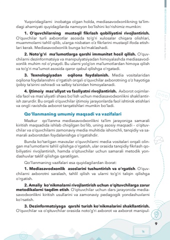 9MEDIASAVODXONLIK bo%u2018yicha metodik qo%u2018llanmaYuqoridagilarni inobatga olgan holda, mediasavodxonlikning ta%u2019limdagi ahamiyati quyidagilarda namoyon bo%u2018lishini ko%u2018rishimiz mumkin:1. O%u2018quvchilarning mustaqil fikrlash qobiliyatini rivojlantirish.O%u2018quvchilar turli axborotlar asosida to%u2018g%u2018ri xulosalar chiqara olishlari, muammolarni tahlil qilib, ularga nisbatan o%u2018z fikrlarini mustaqil ifoda etishlari kerak. Mediasavodxonlik bunga ko%u2018maklashadi.2. Noto%u2018g%u2018ri ma%u2019lumotlarga qarshi immunitet hosil qilish. O%u2018quvchilarni dezinformatsiya va manipulyatsiyadan himoyalashda mediasavodxonlik muhim rol o%u2018ynaydi. Bu ularni yolg%u2018on ma%u2019lumotlardan himoya qilish va to%u2018g%u2018ri ma%u2019lumot asosida qaror qabul qilishga o%u2018rgatadi.3. Texnologiyadan oqilona foydalanish. Media vositalaridan oqilona foydalanishni o%u2018rgatish orqali o%u2018quvchilar axborotning o%u2018z hayotiga ijobiy ta%u2019sirini oshiradi va salbiy ta%u2019siridan himoyalanadi.4. Ijtimoiy mas%u2019uliyat va faoliyatni rivojlantirish. Axborot oqimlarida faol va mas%u2019uliyatli shaxs bo%u2018lish uchun mediasavodxonlikni shakllantirish zarurdir. Bu orqali o%u2018quvchilar ijtimoiy jarayonlarda faol ishtirok etishlari va ongli ravishda axborot tarqatishlari mumkin bo%u2018ladi.Qo%u2018llanmaning umumiy maqsadi va vazifalariMazkur qo%u2018llanma mediasavodxonlikni ta%u2019lim jarayoniga samarali kiritish maqsadida ishlab chiqilgan bo%u2018lib, uning asosiy maqsadi %u2013 o%u2018qituvchilar va o%u2018quvchilarni zamonaviy media muhitida ishonchli, tanqidiy va samarali axborotdan foydalanishga o%u2018rgatishdir. Bunda ko%u2018tarilgan mavzular o%u2018quvchilarni media vositalari orqali olingan ma%u2019lumotlarni tahlil qilishga o%u2018rgatish, ular orasida tanqidiy fikrlash qobiliyatini rivojlantirish, hamda o%u2018qituvchilar uchun samarali metodik yondashuvlar taklif qilishga qaratilgan.Qo%u2018llanmaning vazifalari esa quyidagilardan iborat: 1. Mediasavodxonlik asoslarini tushuntirish va o%u2018rgatish. O%u2018quvchilarni axborotni saralash, tahlil qilish va ularni to%u2018g%u2018ri talqin qilishga o%u2018rgatish. 2. Amaliy ko%u2018nikmalarni rivojlantirish uchun o%u2018qituvchilarga zarur metodikalarni taqdim etish. O%u2018qituvchilar uchun dars jarayonida mediasavodxonlikni kiritish usullarini va zamonaviy pedagogik yondashuvlarni ko%u2018rsatish. 3. Dezinformatsiyaga qarshi turish ko%u2018nikmalarini shakllantirish. O%u2018quvchilar va o%u2018qituvchilar orasida noto%u2018g%u2018ri axborot va axborot manipul-