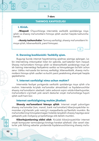 92MEDIASAVODXONLIK bo%u2018yicha metodik qo%u2018llanma7-darsTARMOQ XAVFSIZLIGII. Kirish.%u2022%u0009Maqsad: O%u2018quvchilarga internetda xavfsizlik qoidalariga rioya qilish va shaxsiy ma%u2019lumotlarni himoya qilish usullari haqida tushuncha berish.%u2022%u0009Asosiy tushunchalar: Tarmoq xavfsizligi, shaxsiy ma%u2019lumotlarni himoya qilish, kiberxavfsizlik, parol himoyasi.II. Darsning boshlanishi: Tashkiliy qism.Bugungi kunda internet hayotimizning ajralmas qismiga aylangan. Lekin internetning imkoniyatlari bilan bir qatorda, xavf-xatarlari ham mavjud. Shaxsiy ma%u2019lumotlarni himoya qilish va kiberxavfsizlik qoidalariga rioya qilish bizning internetdagi faoliyatimiz xavfsiz va himoyalangan bo%u2018lishi uchun zarur. Ushbu ma%u2019ruzada biz tarmoq xavfsizligi, kiberxavfsizlik, shaxsiy ma%u2019lumotlarni himoya qilish usullari va kuchli parol yaratishning ahamiyati haqida gaplashamiz.1. Internet xavfsizligi nima uchun muhim?Internetda faoliyat yuritganda xavfsizlik qoidalariga rioya qilish o%u2018ta muhim. Internetda ko%u2018plab ma%u2019lumotlar almashiladi va foydalanuvchilar shaxsiy ma%u2019lumotlarini ulashadi. Lekin axborot oqimi ortida kiberhujumlar, ma%u2019lumotlarni o%u2018g%u2018irlash yoki zararli dasturlar orqali ma%u2019lumotlarga hujum qilish xavfi ham bor.Internet xavfsizligining muhim jihatlari:Shaxsiy ma%u2019lumotlarni himoya qilish: Internet orqali yuborilgan shaxsiy ma%u2019lumotlar (ism, manzil, bank ma%u2019lumotlari) kiberjinoyatchilar tomonidan o%u2018g%u2018irlanishi yoki noto%u2018g%u2018ri maqsadlarda qo%u2018llanilishi mumkin. Bu ma%u2019lumotlarning himoyalanmagan holatda tarqalishi shaxsiy hayotga zarar yetkazishi yoki moliyaviy yo%u2018qotishlarga olib kelishi mumkin.Kiberhujumlarning oldini olish: Ko%u2018plab kiberjinoyatchilar internet orqali kompyuter tarmoqlariga kirishga harakat qilishadi. Ular zararli dasturlar yoki fishing xabarlar yordamida foydalanuvchilarning shaxsiy ma%u2019lu-