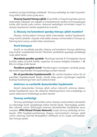 93MEDIASAVODXONLIK bo%u2018yicha metodik qo%u2018llanmamotlarini qo%u2018lga kiritishga intilishadi. Tarmoq xavfsizligi bu kabi hujumlarning oldini olish uchun juda zarur.Shaxsiy hayotni himoya qilish: Ko%u2018pchilik o%u2018z hayotining katta qismini internetda o%u2018tkazadi, shu sababli o%u2018z faoliyatimizni xavfsiz va himoyalangan holda olib borish juda muhim. Axborot xavfsizligini ta%u2019minlash orqali o%u2018z shaxsiy hayotimizni xavfsiz saqlashimiz mumkin.2. Shaxsiy ma%u2019lumotlarni qanday himoya qilish mumkin?Shaxsiy ma%u2019lumotlarni himoya qilish internetdan xavfsiz foydalanishning muhim jihatidir. Quyida internetda shaxsiy ma%u2019lumotlarni himoya qilishning ba%u2019zi asosiy usullari bilan tanishamiz.Parol himoyasiKuchli va murakkab parollar shaxsiy ma%u2019lumotlarni himoya qilishning eng muhim vositalaridan biridir. Parollarni yaratishda quyidagi qoidalarga rioya qilish kerak:Murakkab parollar yaratish: Parolingiz kamida 8-10 belgidan iborat bo%u2018lishi, katta va kichik harflar, raqamlar va maxsus belgilar (masalan, !, @, #)ni o%u2018z ichiga olishi kerak.Parollarni yangilab turish: Parollaringizni muntazam ravishda yangilab turish hujumlardan himoyalanishga yordam beradi.Bir xil parollardan foydalanmaslik: Bir nechta hisoblar uchun bir xil paroldan foydalanmaslik kerak, chunki bitta parol o%u2018g%u2018irlangan taqdirda boshqa hisoblaringiz ham xavf ostida bo%u2018ladi.Antivirus va xavfsizlik dasturlaridan foydalanishZararli dasturlardan himoya qilish uchun ishonchli antivirus dasturlardan foydalanish zarur. Bu dasturlar kiberhujumlarni erta aniqlashga va zararli dasturlarni bloklashga yordam beradi.Tarmoq xavfsizligiTarmoq xavfsizligini ta%u2019minlash uchun shaxsiy ma%u2019lumotlarni almashish va internetga kirish qoidalariga e%u2019tibor berish kerak. Tarmoqdagi xavfsizlikni oshirish uchun shifrlangan internet ulanishlaridan foydalanish zarur, masalan, VPN (Virtual Private Network) orqali tarmoq xavfsizligi ta%u2019minlanadi. VPN foydalanuvchilarning shaxsiy ma%u2019lumotlarini himoya qilish uchun ularning internet faoliyatlarini shifrlaydi va bu orqali xavf-xatarlardan himoya qiladi.