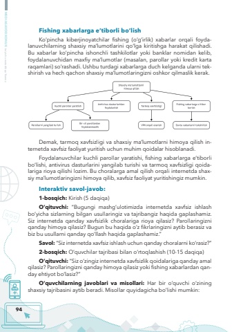 94MEDIASAVODXONLIK bo%u2018yicha metodik qo%u2018llanmaFishing xabarlarga e%u2019tiborli bo%u2018lishKo%u2018pincha kiberjinoyatchilar fishing (o%u2018g%u2018irlik) xabarlar orqali foydalanuvchilarning shaxsiy ma%u2019lumotlarini qo%u2018lga kiritishga harakat qilishadi. Bu xabarlar ko%u2018pincha ishonchli tashkilotlar yoki banklar nomidan kelib, foydalanuvchidan maxfiy ma%u2019lumotlar (masalan, parollar yoki kredit karta raqamlari) so%u2018rashadi. Ushbu turdagi xabarlarga duch kelganda ularni tekshirish va hech qachon shaxsiy ma%u2019lumotlaringizni oshkor qilmaslik kerak.Demak, tarmoq xavfsizligi va shaxsiy ma%u2019lumotlarni himoya qilish internetda xavfsiz faoliyat yuritish uchun muhim qoidalar hisoblanadi. Foydalanuvchilar kuchli parollar yaratishi, fishing xabarlarga e%u2019tiborli bo%u2018lishi, antivirus dasturlarini yangilab turishi va tarmoq xavfsizligi qoidalariga rioya qilishi lozim. Bu choralarga amal qilish orqali internetda shaxsiy ma%u2019lumotlaringizni himoya qilib, xavfsiz faoliyat yuritishingiz mumkin.Interaktiv savol-javob: 1-bosqich: Kirish (5 daqiqa)O%u2018qituvchi: %u201cBugungi mashg%u2018ulotimizda internetda xavfsiz ishlash bo%u2018yicha sizlarning bilgan usullaringiz va tajribangiz haqida gaplashamiz. Siz internetda qanday xavfsizlik choralariga rioya qilasiz? Parollaringizni qanday himoya qilasiz? Bugun bu haqida o%u2018z fikrlaringizni aytib berasiz va biz bu usullarni qanday qo%u2018llash haqida gaplashamiz.%u201dSavol: %u201cSiz internetda xavfsiz ishlash uchun qanday choralarni ko%u2018rasiz?%u201d2-bosqich: O%u2018quvchilar tajribasi bilan o%u2018rtoqlashish (10-15 daqiqa)O%u2018qituvchi: %u201cSiz o%u2018zingiz internetda xavfsizlik qoidalariga qanday amal qilasiz? Parollaringizni qanday himoya qilasiz yoki fishing xabarlardan qanday ehtiyot bo%u2018lasiz?%u201dO%u2018quvchilarning javoblari va misollari: Har bir o%u2018quvchi o%u2018zining shaxsiy tajribasini aytib beradi. Misollar quyidagicha bo%u2018lishi mumkin: