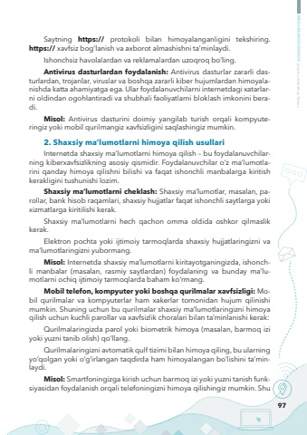 97MEDIASAVODXONLIK bo%u2018yicha metodik qo%u2018llanmaSaytning https:// protokoli bilan himoyalanganligini tekshiring. https:// xavfsiz bog%u2018lanish va axborot almashishni ta%u2019minlaydi.Ishonchsiz havolalardan va reklamalardan uzoqroq bo%u2018ling.Antivirus dasturlardan foydalanish: Antivirus dasturlar zararli dasturlardan, trojanlar, viruslar va boshqa zararli kiber hujumlardan himoyalanishda katta ahamiyatga ega. Ular foydalanuvchilarni internetdagi xatarlarni oldindan ogohlantiradi va shubhali faoliyatlarni bloklash imkonini beradi.Misol: Antivirus dasturini doimiy yangilab turish orqali kompyuteringiz yoki mobil qurilmangiz xavfsizligini saqlashingiz mumkin.2. Shaxsiy ma%u2019lumotlarni himoya qilish usullariInternetda shaxsiy ma%u2019lumotlarni himoya qilish %u2013 bu foydalanuvchilarning kiberxavfsizlikning asosiy qismidir. Foydalanuvchilar o%u2018z ma%u2019lumotlarini qanday himoya qilishni bilishi va faqat ishonchli manbalarga kiritish kerakligini tushunishi lozim.Shaxsiy ma%u2019lumotlarni cheklash: Shaxsiy ma%u2019lumotlar, masalan, parollar, bank hisob raqamlari, shaxsiy hujjatlar faqat ishonchli saytlarga yoki xizmatlarga kiritilishi kerak.Shaxsiy ma%u2019lumotlarni hech qachon omma oldida oshkor qilmaslik kerak.Elektron pochta yoki ijtimoiy tarmoqlarda shaxsiy hujjatlaringizni va ma%u2019lumotlaringizni yubormang.Misol: Internetda shaxsiy ma%u2019lumotlarni kiritayotganingizda, ishonchli manbalar (masalan, rasmiy saytlardan) foydalaning va bunday ma%u2019lumotlarni ochiq ijtimoiy tarmoqlarda baham ko%u2018rmang.Mobil telefon, kompyuter yoki boshqa qurilmalar xavfsizligi: Mobil qurilmalar va kompyuterlar ham xakerlar tomonidan hujum qilinishi mumkin. Shuning uchun bu qurilmalar shaxsiy ma%u2019lumotlaringizni himoya qilish uchun kuchli parollar va xavfsizlik choralari bilan ta%u2019minlanishi kerak:Qurilmalaringizda parol yoki biometrik himoya (masalan, barmoq izi yoki yuzni tanib olish) qo%u2018llang.Qurilmalaringizni avtomatik qulf tizimi bilan himoya qiling, bu ularning yo%u2018qolgan yoki o%u2018g%u2018irlangan taqdirda ham himoyalangan bo%u2018lishini ta%u2019minlaydi.Misol: Smartfoningizga kirish uchun barmoq izi yoki yuzni tanish funksiyasidan foydalanish orqali telefoningizni himoya qilishingiz mumkin. Shu