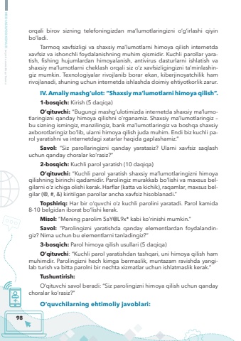 98MEDIASAVODXONLIK bo%u2018yicha metodik qo%u2018llanmaorqali birov sizning telefoningizdan ma%u2019lumotlaringizni o%u2018g%u2018irlashi qiyin bo%u2018ladi.Tarmoq xavfsizligi va shaxsiy ma%u2019lumotlarni himoya qilish internetda xavfsiz va ishonchli foydalanishning muhim qismidir. Kuchli parollar yaratish, fishing hujumlardan himoyalanish, antivirus dasturlarni ishlatish va shaxsiy ma%u2019lumotlarni cheklash orqali siz o%u2018z xavfsizligingizni ta%u2019minlashingiz mumkin. Texnologiyalar rivojlanib borar ekan, kiberjinoyatchilik ham rivojlanadi, shuning uchun internetda ishlashda doimiy ehtiyotkorlik zarur.IV. Amaliy mashg%u2018ulot: %u201cShaxsiy ma%u2019lumotlarni himoya qilish%u201d.1-bosqich: Kirish (5 daqiqa)O%u2018qituvchi: %u201cBugungi mashg%u2018ulotimizda internetda shaxsiy ma%u2019lumotlaringizni qanday himoya qilishni o%u2018rganamiz. Shaxsiy ma%u2019lumotlaringiz %u2013 bu sizning ismingiz, manzilingiz, bank ma%u2019lumotlaringiz va boshqa shaxsiy axborotlaringiz bo%u2018lib, ularni himoya qilish juda muhim. Endi biz kuchli parol yaratishni va internetdagi xatarlar haqida gaplashamiz.%u201dSavol: %u201cSiz parollaringizni qanday yaratasiz? Ularni xavfsiz saqlash uchun qanday choralar ko%u2018rasiz?%u201d2-bosqich: Kuchli parol yaratish (10 daqiqa)O%u2018qituvchi: %u201cKuchli parol yaratish shaxsiy ma%u2019lumotlaringizni himoya qilishning birinchi qadamidir. Parolingiz murakkab bo%u2018lishi va maxsus belgilarni o%u2018z ichiga olishi kerak. Harflar (katta va kichik), raqamlar, maxsus belgilar (@, #, &) kiritilgan parollar ancha xavfsiz hisoblanadi.%u201dTopshiriq: Har bir o%u2018quvchi o%u2018z kuchli parolini yaratadi. Parol kamida 8-10 belgidan iborat bo%u2018lishi kerak.Misol: %u201cMening parolim 5aY@L9x* kabi ko%u2018rinishi mumkin.%u201dSavol: %u201cParolingizni yaratishda qanday elementlardan foydalandingiz? Nima uchun bu elementlarni tanladingiz?%u201d3-bosqich: Parol himoya qilish usullari (5 daqiqa)O%u2018qituvchi: %u201cKuchli parol yaratishdan tashqari, uni himoya qilish ham muhimdir. Parolingizni hech kimga bermaslik, muntazam ravishda yangilab turish va bitta parolni bir nechta xizmatlar uchun ishlatmaslik kerak.%u201dTushuntirish:O%u2018qituvchi savol beradi: %u201cSiz parolingizni himoya qilish uchun qanday choralar ko%u2018rasiz?%u201dO%u2018quvchilarning ehtimoliy javoblari: