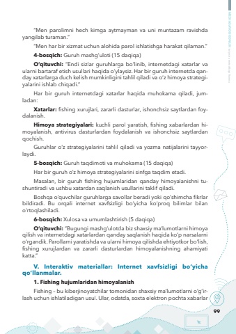 99MEDIASAVODXONLIK bo%u2018yicha metodik qo%u2018llanma%u201cMen parolimni hech kimga aytmayman va uni muntazam ravishda yangilab turaman.%u201d%u201cMen har bir xizmat uchun alohida parol ishlatishga harakat qilaman.%u201d4-bosqich: Guruh mashg%u2018uloti (15 daqiqa)O%u2018qituvchi: %u201cEndi sizlar guruhlarga bo%u2018linib, internetdagi xatarlar va ularni bartaraf etish usullari haqida o%u2018ylaysiz. Har bir guruh internetda qanday xatarlarga duch kelish mumkinligini tahlil qiladi va o%u2018z himoya strategiyalarini ishlab chiqadi.%u201dHar bir guruh internetdagi xatarlar haqida muhokama qiladi, jumladan:Xatarlar: fishing xurujlari, zararli dasturlar, ishonchsiz saytlardan foydalanish.Himoya strategiyalari: kuchli parol yaratish, fishing xabarlardan himoyalanish, antivirus dasturlardan foydalanish va ishonchsiz saytlardan qochish.Guruhlar o%u2018z strategiyalarini tahlil qiladi va yozma natijalarini tayyorlaydi.5-bosqich: Guruh taqdimoti va muhokama (15 daqiqa)Har bir guruh o%u2018z himoya strategiyalarini sinfga taqdim etadi.Masalan, bir guruh fishing hujumlaridan qanday himoyalanishni tushuntiradi va ushbu xatardan saqlanish usullarini taklif qiladi.Boshqa o%u2018quvchilar guruhlarga savollar beradi yoki qo%u2018shimcha fikrlar bildiradi. Bu orqali internet xavfsizligi bo%u2018yicha ko%u2018proq bilimlar bilan o%u2018rtoqlashiladi.6-bosqich: Xulosa va umumlashtirish (5 daqiqa)O%u2018qituvchi: %u201dBugungi mashg%u2018ulotda biz shaxsiy ma%u2019lumotlarni himoya qilish va internetdagi xatarlardan qanday saqlanish haqida ko%u2018p narsalarni o%u2018rgandik. Parollarni yaratishda va ularni himoya qilishda ehtiyotkor bo%u2018lish, fishing xurujlardan va zararli dasturlardan himoyalanishning ahamiyati katta.%u201dV. Interaktiv materiallar: Internet xavfsizligi bo%u2018yicha qo%u2018llanmalar.1. Fishing hujumlaridan himoyalanishFishing %u2013 bu kiberjinoyatchilar tomonidan shaxsiy ma%u2019lumotlarni o%u2018g%u2018irlash uchun ishlatiladigan usul. Ular, odatda, soxta elektron pochta xabarlar